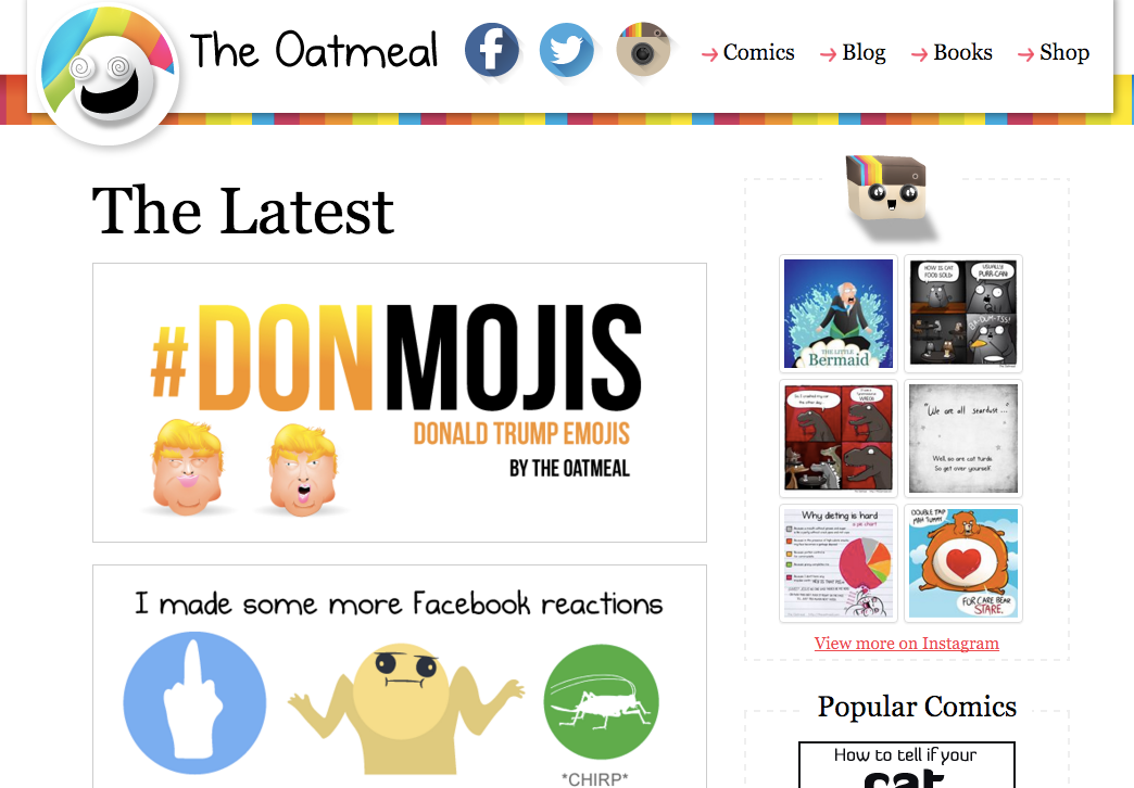 미국에서 가장 대표적인 웹툰을 꼽으라면 The Oatmeal 일듯. 이걸 보고 미국인들도 웹툰이라는 포맷에 그다지 거부감이 없구나 라는 것을 생각하게 됨. 처음에는 그냥 작가의 취미생활로 웹툰 몇개로 시작했던것 것이 지금은 미국 젊은층들의 상당수가 알고 있는 하나의 브랜드로 자리를 잡음.